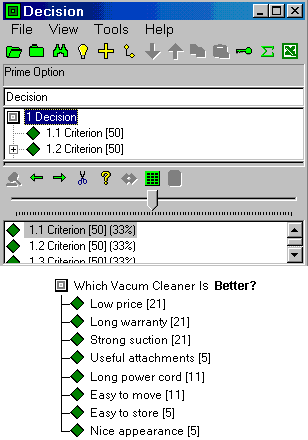 Prime Option asks user to identify various decision making criteria and weight them against others. User can choose to use pair-wise comparisons which will provide an additional benefit of measuring the decision making consistency. Prime Option uses templates to encourage information sharing, knowledge accumulation and learning.